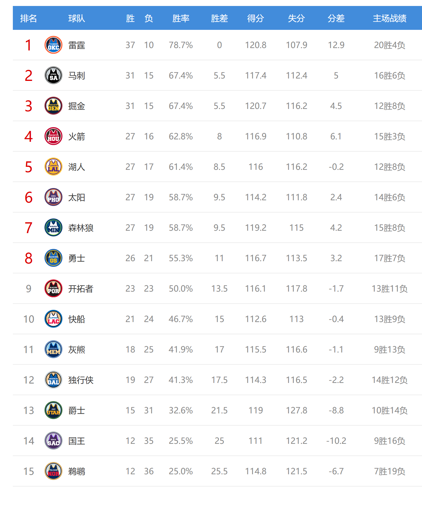 北京时间2026年1月26日,今日NBA有8场比赛,有2场比赛(掘金vs灰熊、独行侠vs雄鹿)因恶劣天气延期,另外6场正常举行,勇士、快船、雷霆、马刺、森林狼、太阳、国王、鹈鹕参与其中,赛后西部排名有何变化呢?